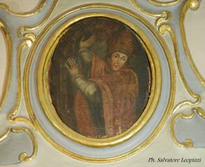 La piccola tela è annerita dal tempo e difficile da osservare nei dettagli, vista anche la sua collocazione in alto e priva di una fonte di luce naturale: si capisce però che.raffigura un santo vescovo nell’atto di fermare il crollo di un edificio.