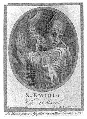 Questa particolare iconografia permette di concludere che ci troviamo di fronte ad una tela raffigurante sant’Emidio da Ascoli. L’immagine risulta infatti coincidente con una stampa conservata presso la Pinacoteca Civica di Ascoli Piceno e con la quale può esser raffrontata specularmente. Questa stampa fa parte di una collezione di immagini commerciali prodotte dallo stampatore romano Agapito Franzetti su disegno del pittore Luigi Agricola (1750 – 1821) e molto diffuse tra la seconda metà del Settecento e i primi dell’Ottocento.