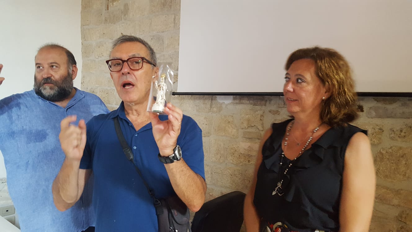 Scambio di doni: l’associazione offre all’Alcaldesa di Almoradí una miniatura del sant’Emidio argenteo di Pietro Vannini (sec. XV).