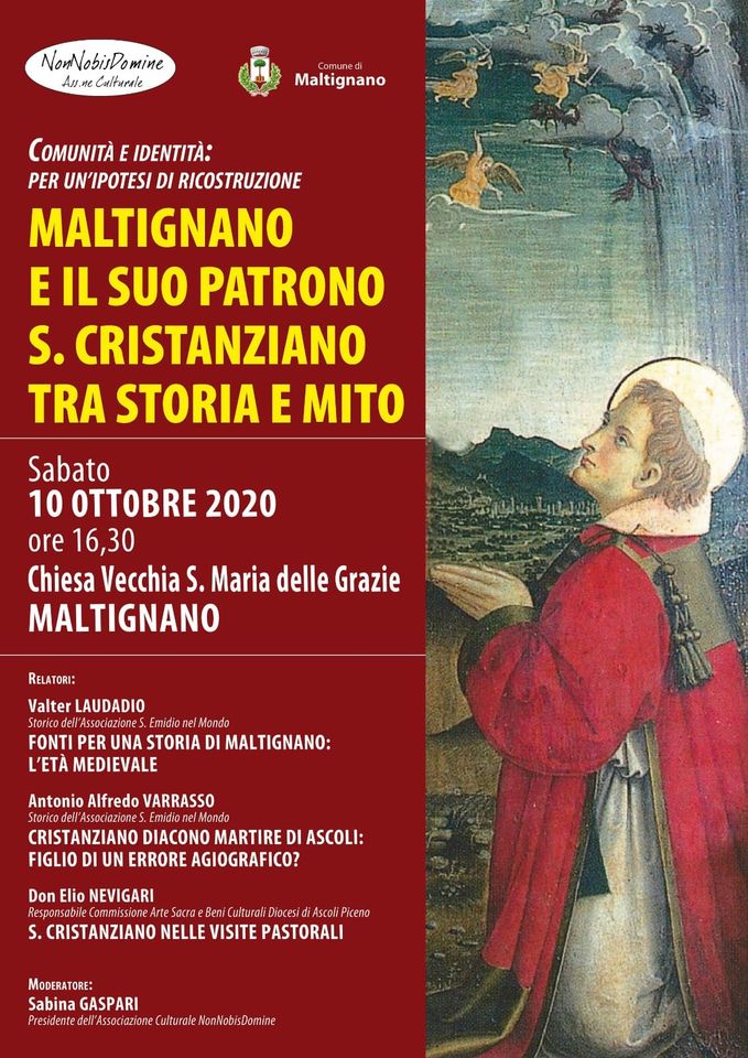 Tuttavia sappiamo veramente poco,troppo poco, di questa fondamentale istituzione ecclesiastica. Che piacerebbe collocare – è una nostra aspirazione! – anche sul piano culturale, oltre che sociale, alle radici di quella vera e propria scoperta, o riscoperta che dir si voglia, di un Cristanziano erede, fisico e morale, della gens Maltiniana. Un fatto, questo relazionabile all’altro, ben noto, dei fasti carolingi attraverso i quali, passò la concessione feudale di Maltignano ai Canonici per mano dello stesso Carlo Magno! Non direi casuale che solo in Ascoli sia ben percepibile questa variante biografica cristanzianea! O, forse, percepita da quei pochi che erano in grado di intenderla e di farla intendere. Restano, poi, da ricollegare in un quadro unitario le diverse esperienze cultuali, a cui accennavo, di Lodi, dell’Abruzzo casauriense e chietino e, particolarmente, del Molise triventino, con al centro quella vera e propria ‘capitale’ meridionale emidiana che è Agnone. Dove Cristanziano, da diacono, ad un certo punto diventa vescovo ‘mitrato’ e che soppianta, quasi senza colpo ferire, lo stesso Marco Evangelista, ancora nel Quattrocento al vertice del patronato cittadino. E Cristanziano fa tutto questo mediante una apparizione nel cielo cittadino! In Agnone, e finisco, gli Ascolani si erano incontrati con i Veneziani.Certamente, non solo lì si realizzò un incontro commerciale e, conseguentemente, culturale tra le due Cittadinanze tra Due e Trecento. Anzi! Ci si apre innanzi, in questo modo, però, proprio per la storia degli studi, ascolani in particolare, un paesaggio inesplorato fin qui, quello del cammino commerciale dei figli di Emidio lungo tutto il versante adriatico e fino alla Capitale del Regno, a Napoli! Nella lettera del 1758 del Vescovo Pitocco agli Ascolani, sopra ricordata, si richiama sensibilmente l’iniziativa dei mercanti, che avevano concorso direttamente a costruire in Agnone la chiesa dedicata a sant’Emidio, installandovi – dice il presule – ben otto sacerdoti. Altro che gemellaggio! Questo è un vero e proprio investimento! Il ‘nostro’ Marcucci, che a quella lettera si incaricò di rispondere, allegandovi il suo “Ristretto” su Cristanziano, non esita a mostrare la sua meraviglia e la sua compiacenza nel leggere quelle informazioni. Che in parte erano già note, come all’Andreantonelli, ben conosciuto dal Marcucci stesso. Ma credo che la meraviglia del Marcucci e dunque il suo fervoroso riscontro si determinassero nel cogliere la particolarità di quelle referenze, che uscivano dalla genericità del racconto andreantonelliano, da lui già fieramente contestato per molti altri versi, ad evocare, con dovizia di particolari inediti, un fatto storico senza precedenti, fino ad allora non adeguatamente valutato ed apprezzato. Il che – ed ho veramente terminato – il che gli porge un magnifico destro ad additare Cristanziano, inseparabile Campione ascolano di Emidio nel Cielo e nella Terra! E questo suo notevole cammino, tutto da riscoprire e da ridisegnare, lo rileviamo da una tradizione di fatti – proprio nel senso letterale del termine – ovvero dal racconto che allo stato dell’arte esige un più tenace ed accorto lavoro di ricostruzione. Una ricomposizione che sia anche filologica, per isolarne il nucleo iniziale e poi comprendere, riconoscendoli a loro volta, tutti quegl’incrementi che nel tempo lo hanno arricchito, particolarmente in Ascoli, imponendolo, soprattutto tramite il Marcucci, come testo ufficiale della pratica devozionale. In tal senso, infatti, venne formandosi l’Ufficio liturgico del santo, definitivamente approvato, ma sarebbe meglio dire ‘riconfermato’ nel 1803, dopo essere stato ‘sospeso’ a metà Seicento. Nella promozione cultuale, intanto, possiamo avvertire, soprattutto qui a Maltignano, un ruolo significativo del Capitolo Cattedrale di Ascoli, tanto nelle vesti di feudatario di fatto del Paese quanto nel contesto signorile ed aristocratico della Città. Tuttavia sappiamo veramente poco,troppo poco, di questa fondamentale istituzione ecclesiastica. Che piacerebbe collocare – è una nostra aspirazione! – anche sul piano culturale, oltre che sociale, alle radici di quella vera e propria scoperta, o riscoperta che dir si voglia, di un Cristanziano erede, fisico e morale, della gens Maltiniana. Un fatto, questo relazionabile all’altro, ben noto, dei fasti carolingi attraverso i quali, passò la concessione feudale di Maltignano ai Canonici per mano dello stesso Carlo Magno! Non direi casuale che solo in Ascoli sia ben percepibile questa variante biografica cristanzianea! O, forse, percepita da quei pochi che erano in grado di intenderla e di farla intendere. Restano, poi, da ricollegare in un quadro unitario le diverse esperienze cultuali, a cui accennavo, di Lodi, dell’Abruzzo casauriense e chietino e, particolarmente, del Molise triventino, con al centro quella vera e propria ‘capitale’ meridionale emidiana che è Agnone. Dove Cristanziano, da diacono, ad un certo punto diventa vescovo ‘mitrato’ e che soppianta, quasi senza colpo ferire, lo stesso Marco Evangelista, ancora nel Quattrocento al vertice del patronato cittadino. E Cristanziano fa tutto questo mediante una apparizione nel cielo cittadino! In Agnone, e finisco, gli Ascolani si erano incontrati con i Veneziani.Certamente, non solo lì si realizzò un incontro commerciale e, conseguentemente, culturale tra le due Cittadinanze tra Due e Trecento. Anzi! Ci si apre innanzi, in questo modo, però, proprio per la storia degli studi, ascolani in particolare, un paesaggio inesplorato fin qui, quello del cammino commerciale dei figli di Emidio lungo tutto il versante adriatico e fino alla Capitale del Regno, a Napoli! Nella lettera del 1758 del Vescovo Pitocco agli Ascolani, sopra ricordata, si richiama sensibilmente l’iniziativa dei mercanti, che avevano concorso direttamente a costruire in Agnone la chiesa dedicata a sant’E